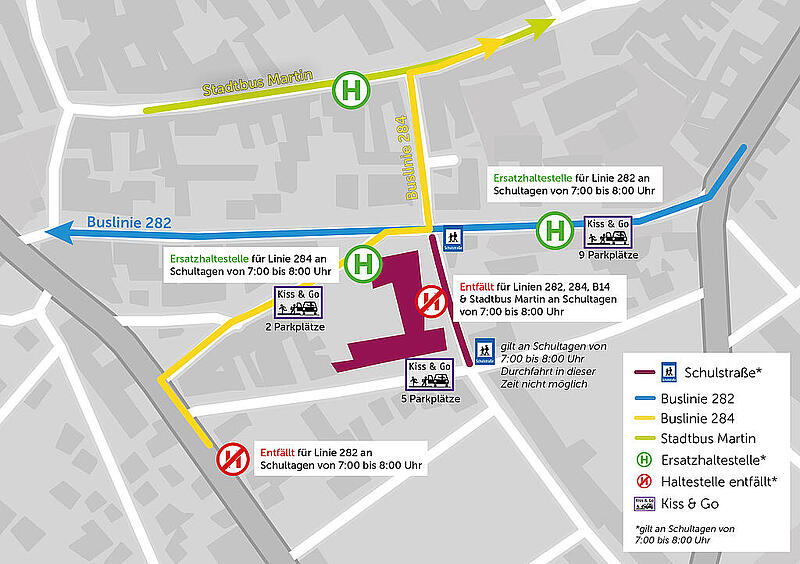 Die Schulstraße wird durch mechanische Absperrungen mit Scherengittern gesichert. Während der Sperrzeit dürfen keine Autos, Motorräder etc. einfahren. Stadt- und Linienbusse werden in dieser Zeit umgeleitet – Ersatzhaltestellen werden eingerichtet. Kinder dürfen die Fahrbahn zu Fuß benutzen. Außerhalb der festgelegten Zeiten gelten die üblichen Verkehrsregeln. Um den morgendlichen Bringverkehr zu entlasten, wurden im Umfeld der Schule die bestehenden „Kiss & Go“-Zonen bzw. Elternhaltestellen erweitert. „Mit der Einführung der Schulstraße setzt Eisenstadt ein klares Zeichen: Sicherheit und kindgerechte Mobilität haben Vorrang vor morgendlichem Autoverkehr“, so Steiner.